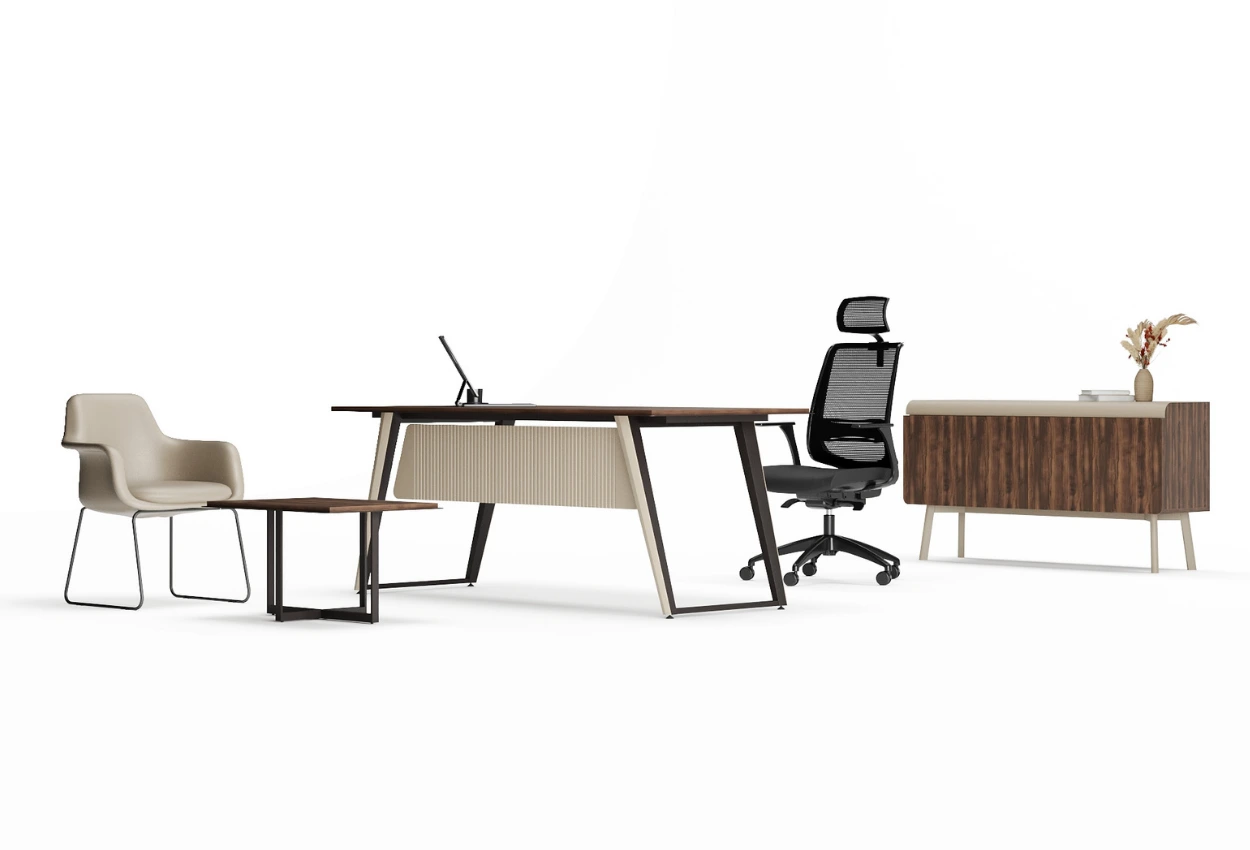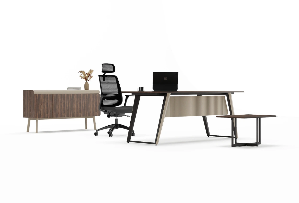 ARTEK MID, zarif detaylarla güçlendirilmiş sade bir tasarıma sahiptir. Koyu ahşap yüzeyler ve açılı ayak yapısı, ofis ortamına modern bir duruş kazandırır. Dokulu pano uygulamasıyla estetik görünümünü tamamlayan takım, konforlu ve odaklı bir çalışma alanı sunar.