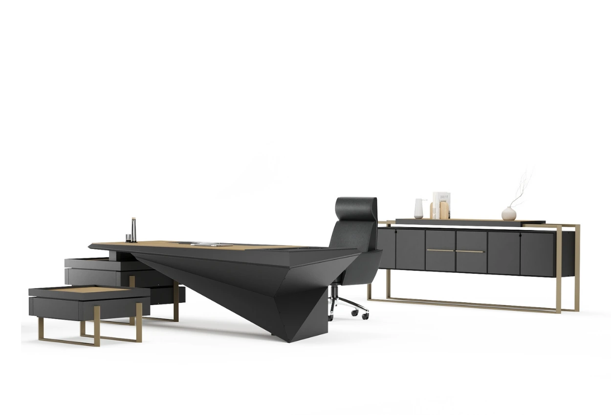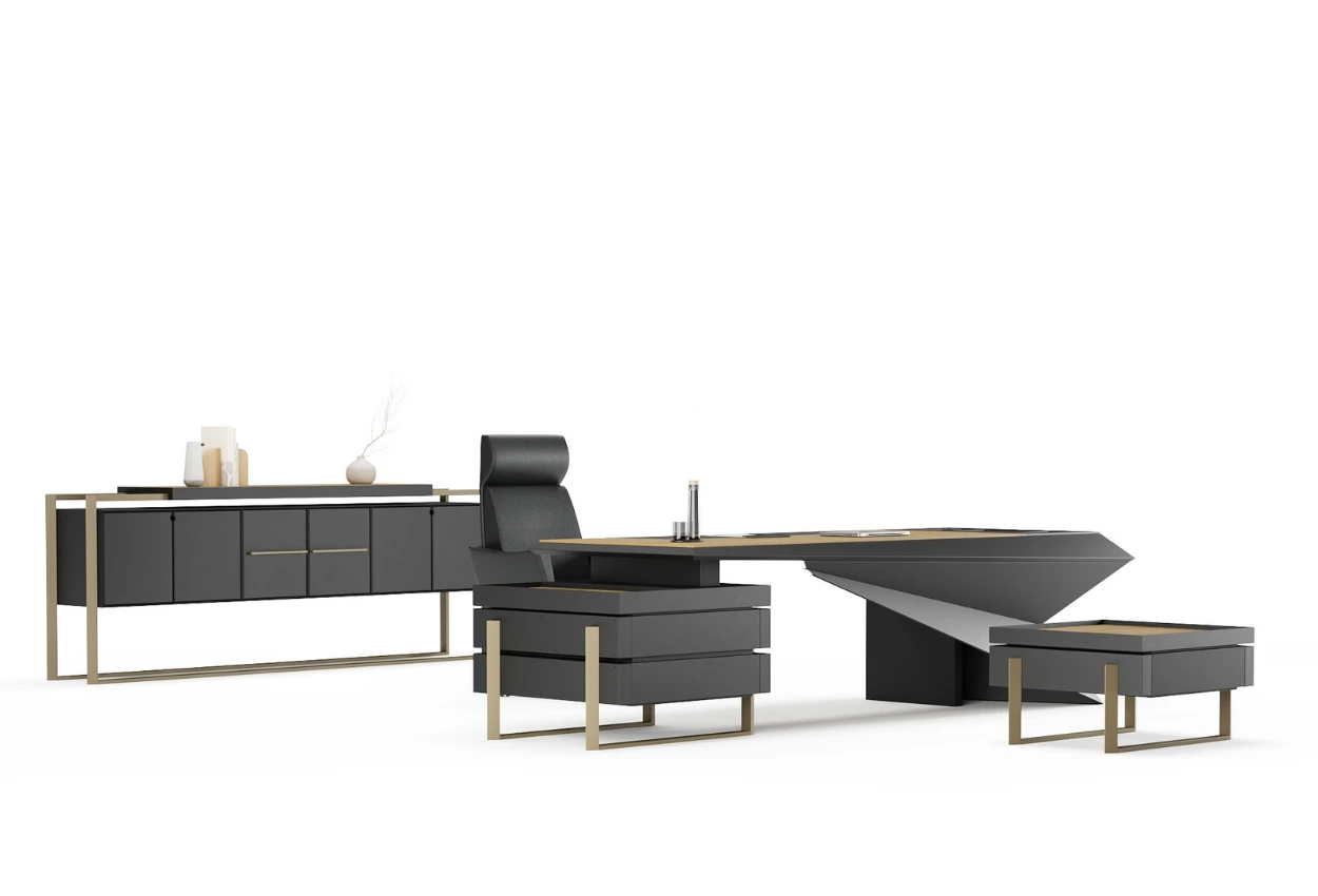 Mimari bir heykel gibi… CLON, keskin hatları ve üçgen formuyla güçlü bir duruş sergilerken, siyah ve ahşap tonlarının dengesiyle modern bir ofis kimliği sunar. Sanatsal bir cesaretin simgesi olan bu takım, liderliğe estetik bir yorum katar.