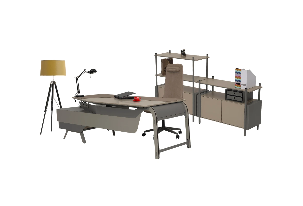 SCOTIA, yuvarlatılmış köşeleri ve yumuşak renk geçişleriyle çalışma ortamına sıcaklık katar. Sert hatlardan uzak durarak daha samimi, daha rahat bir atmosfer sunar. Detaylardaki sadelik ve raf sistemindeki açıklık, işlevsellikle özgürlüğü buluşturur.